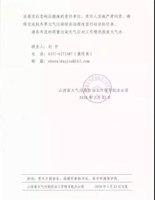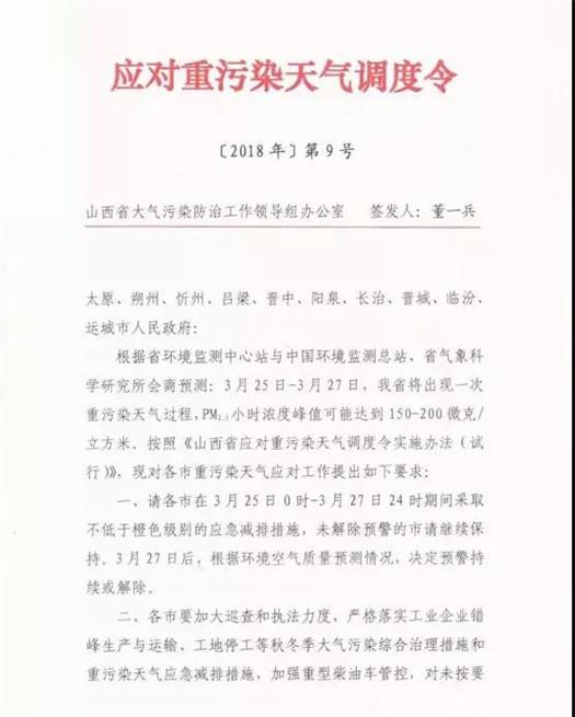 山西省大氣污染防治工作領(lǐng)導(dǎo)組辦公室3月23日發(fā)布了今年第9號(hào)應(yīng)對(duì)重污染天氣調(diào)度令,要求除大同外各市于3月25日0時(shí)-3月27日24時(shí)期間,積極應(yīng)對(duì)重污染天氣過程。