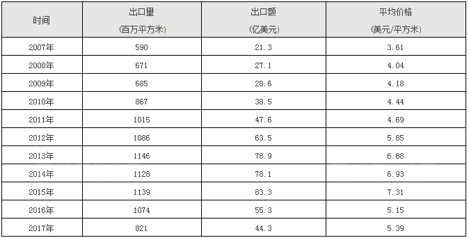 表3:2007年-2017年全國陶瓷磚出口統(tǒng)計(jì)