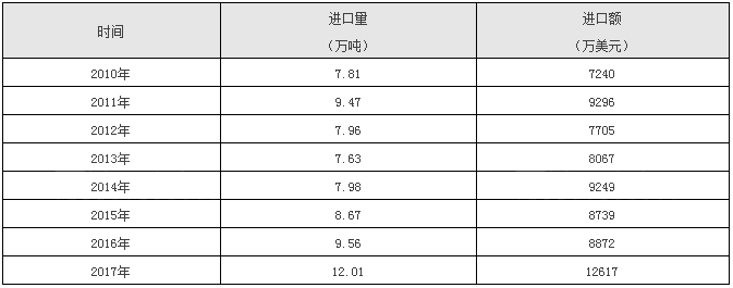 表5:2010年-2017年全國陶瓷磚進(jìn)口統(tǒng)計(jì)