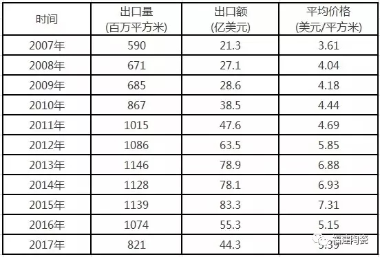 2007-2017年全國(guó)陶瓷磚出口統(tǒng)計(jì)