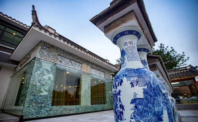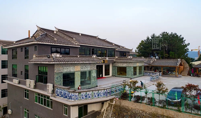 “千窯萬(wàn)瓷墻”一共使用了10萬(wàn)多塊古瓷片,以及部分保存完整的清代青花瓷盤(pán),如位于左右兩側(cè)的龍紋盤(pán)與鳳紋盤(pán)等。這些瓷片與瓷盤(pán)均由德化大興堡鄭氏家族歷代傳承而來(lái)。盡管整個(gè)墻體看不到明顯的圖案,卻能在錯(cuò)落的瓷片之中感受到青花瓷的美感,故有“縱有珠寶一箱,不如瓷瓦一方”的說(shuō)法。