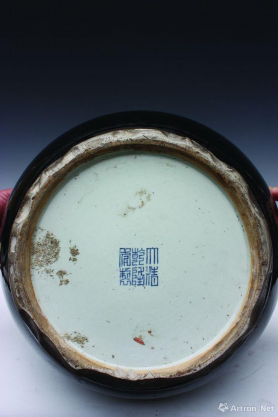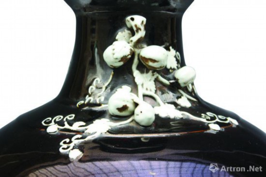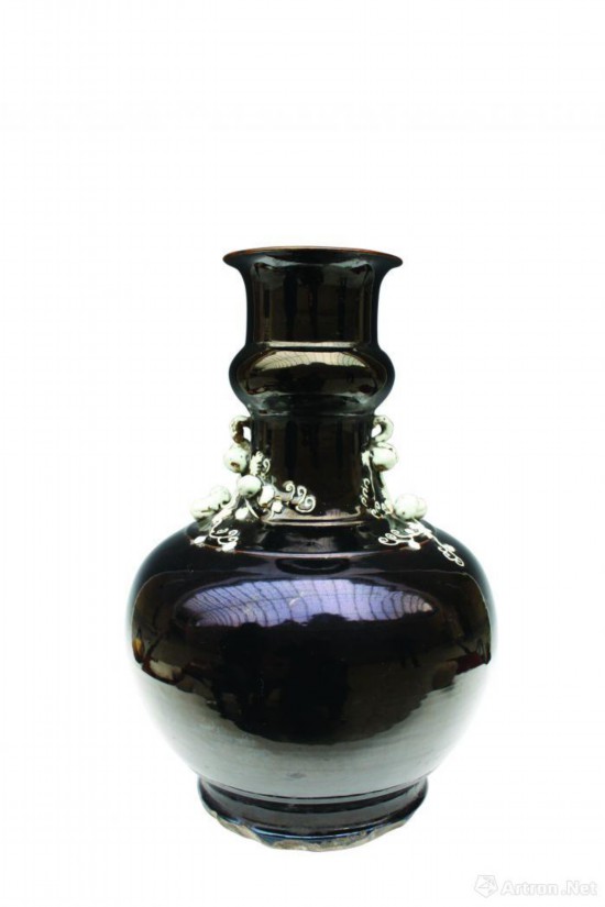 江蘇省鎮(zhèn)江博物館藏清乾隆款黑釉白花大瓷瓶(見圖),高58.5、口徑18.3、足徑23.5厘米?谘赝獬,長頸,頸中部凸起,溜望,鼓腹,圈足。足底部“大清乾隆年制”三行六字篆書款。頸部飾二道凸起的弦紋,并飾有白色瓜果,枝葉纏繞。釉面光潤透亮,色黑如漆,色白如粉。顯得凝重華貴,自有氣勢。烏金釉不易燒制成功,成品率低。關(guān)于烏金釉的配制方法,康熙六十一年法國耶穌會傳教士昂特雷克萊在景德鎮(zhèn)寫給該教會會計(jì)奧日神父的信中談到烏金釉的配制方法:“要賦予瓷器以帶光彩的黑色或稱之為烏光色,就將瓷坯浸在以青料為主要成分的混合釉中。制作烏金釉一定要使用優(yōu)質(zhì)青料,但其濃度要求稍大一些,配制時將青料與白釉、紫金釉混合,并添加少量石灰與鳳尾草灰配制的釉灰……”