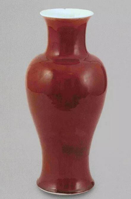 郎窯紅釉是康熙晚期景德鎮(zhèn)仿燒明代永樂、宣德時(shí)期鮮紅釉瓷器而產(chǎn)生紅釉新品種?滴跛氖哪曛廖迨荒辏餮矒峒婢暗骆(zhèn)御窯廠督理主持窯務(wù),由于清代官窯瓷器常以督陶官姓氏冠以窯名,所以在郎廷極為督陶官期間創(chuàng)燒的紅釉新品種,稱為郎窯紅釉。郎窯紅釉瓷器,以氧化銅為著色劑,生坯掛釉,入窯經(jīng)1300℃高溫再還原氣氛中一次燒成。郎窯紅釉瓷器造型以瓶、尊為主,尤以觀音尊最有特色,釉色鮮紅,顏色隨垂流逐漸加深,釉面清亮,玻璃質(zhì)感較強(qiáng),釉面有開片、鬃眼和牛毛細(xì)紋,口部釉薄露出胎骨白色,紅釉垂流通常不過底足,有“脫口垂足郎不流”之說,底足為“米湯底”或“蘋果綠底”,偶見紅釉底,一般不署款識。