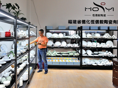 “德化日用家居瓷多以茶具為主,做餐具的很少。有的陶瓷企業(yè)生產(chǎn)的餐具還是從廣東或山西等地拿半成品來代加工,完全沒有德化的品牌特色。其實,德化白瓷瓷質(zhì)好,做出來的餐具比其他地方更美觀耐用。”早年曾在德化協(xié)發(fā)光洋陶器有限公司等幾家德化大型日用家居瓷企業(yè)從事陶瓷生產(chǎn)管理的許簪廣,一年多前與朋友一起成立德化恒信毅陶瓷公司,主要從事陶瓷餐具的生產(chǎn)和銷售。公司成立之初,他通過線上、線下多渠道推廣產(chǎn)品,慢慢打開了市場,如今一些外地客商還慕名到德化找他訂購餐具產(chǎn)品。