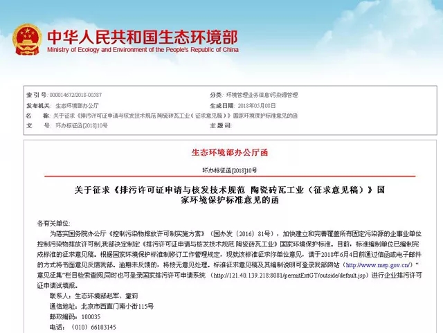 5月8日,生態(tài)環(huán)保部官網(wǎng)發(fā)布公函稱:為加快建立和完善覆蓋所有固定污染源的企事業(yè)單位控制污染物排放許可制,決定制定《排污許可證申請(qǐng)與核發(fā)技術(shù)規(guī)范 陶瓷磚瓦工業(yè)》國家環(huán)境保護(hù)標(biāo)準(zhǔn),并發(fā)布標(biāo)準(zhǔn)《征求意見稿》。