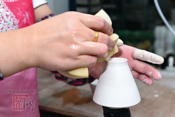 “雅自玉瓷”的工人在給坯體擦水,每道工序都嚴格把關(guān)。
