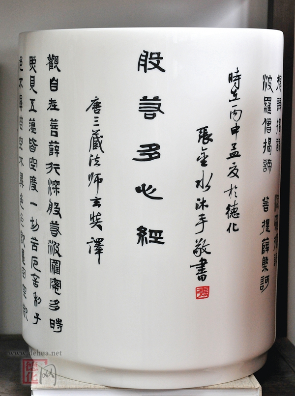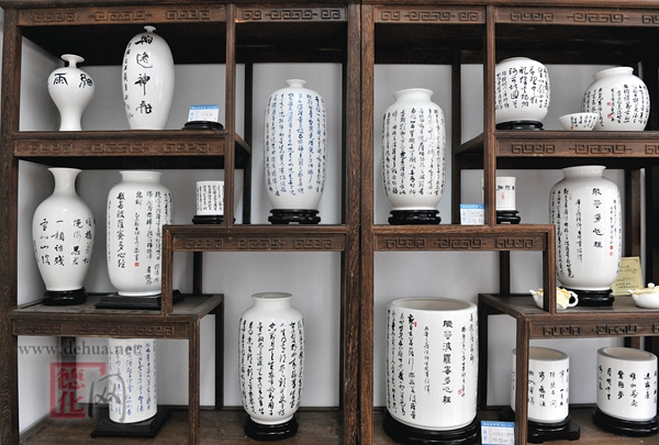 德化白瓷通透純潔,猶如羊脂美玉,是極好的表現(xiàn)載體。張金水把書(shū)法和傳統(tǒng)陶瓷技藝結(jié)合,素胚勾勒,筆走龍蛇,他的瓷字時(shí)而溫和典雅、時(shí)而雄強(qiáng)奇崛、時(shí)而自然散逸、時(shí)而高古曠達(dá),筆盡意未盡,細(xì)品之下良多趣味。不斷探索書(shū)法藝術(shù)風(fēng)格、努力嘗試各種陶瓷器型,進(jìn)一步提高德化陶瓷的藝術(shù)價(jià)值,這便是張金水一直以來(lái)的夢(mèng)想。