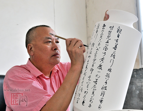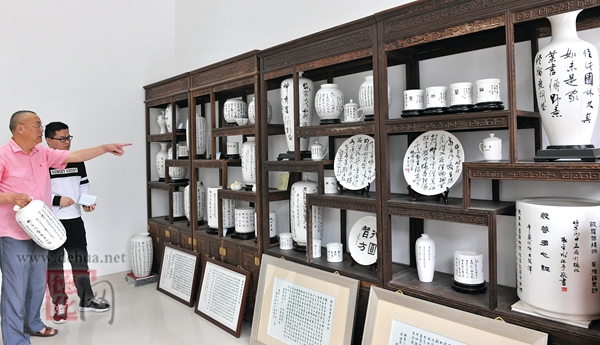 “當(dāng)時(shí)德化有在陶瓷上繪畫(huà)的,有對(duì)應(yīng)題詩(shī)詞的,但還沒(méi)有一個(gè)在陶瓷上進(jìn)行書(shū)法創(chuàng)作,使之成為一件完整的書(shū)法作品的,我因?yàn)橐恢痹趯?xiě)瓷字,便希望能夠在這些方面有所突破。”張金水說(shuō)。