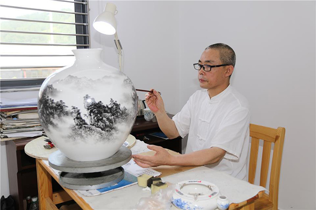 怡豐園實(shí)業(yè)公司總經(jīng)理、廣東省陶瓷藝術(shù)大師黃建宏在進(jìn)行高端青花骨質(zhì)瓷彩繪創(chuàng)作