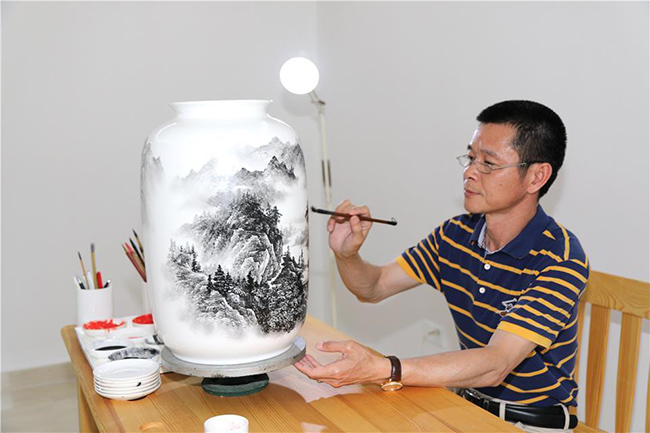 富大陶瓷公司的工藝美術(shù)師在進(jìn)行青花瓷彩繪創(chuàng)作