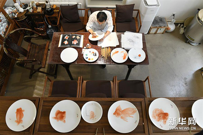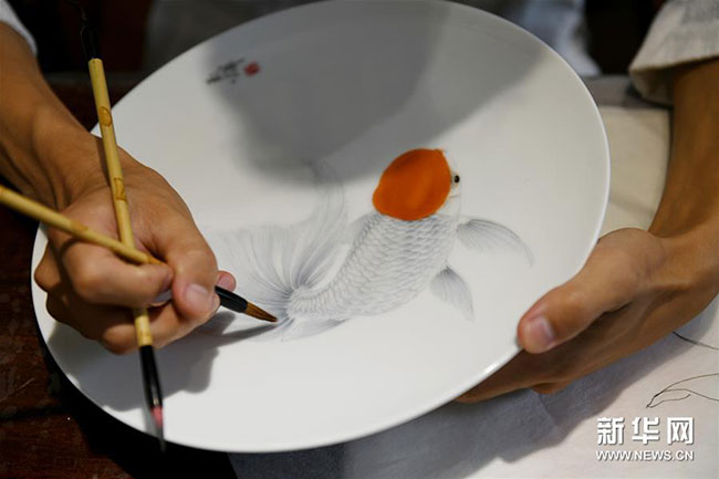 “80后”陶瓷彩繪師楊玉輝是山東人,從小酷愛繪畫,于2005年考入江西省景德鎮(zhèn)學(xué)院,從此與陶瓷結(jié)下不解之緣。畢業(yè)后,楊玉輝來到石家莊一家文化創(chuàng)意園創(chuàng)業(yè),他以陶瓷為載體,不斷創(chuàng)新。近年來他的金魚瓷畫作品粉潤淡雅、簡潔明快,深受人們喜愛。