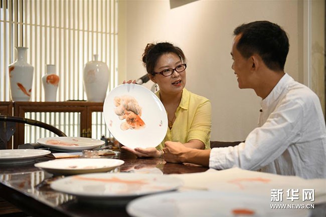 6月22日,陶瓷彩繪師楊玉輝在與同事討論成品。