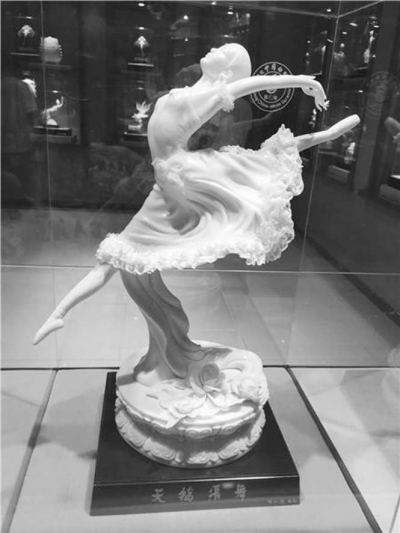 中國白藝術(shù)宮內(nèi)不僅有國宴瓷和國禮瓷,還陳列著陳仁海創(chuàng)作的600多件專利紀(jì)念瓷,牽著名犬的貴婦、憨態(tài)可掬的歡喜佛、正義凜然的關(guān)二爺、姿態(tài)優(yōu)美的舞者……就連舞者舞裙上的蕾絲都清晰可見,層層疊疊,每一個細節(jié)都清晰可見。據(jù)中國白藝術(shù)宮工作人員表示,如今的陶瓷燒制主要都是靠電來控制精準(zhǔn)度,例如這尊“天鵝飛舞”,它是一體燒制,由于蕾絲部分薄如蟬翼,比較脆弱,需要先用低溫?zé)仆瓿珊,再用高溫(zé)浦黧w部分。每一個細節(jié)都需要精準(zhǔn),一個不慎可能就需要重新制作。