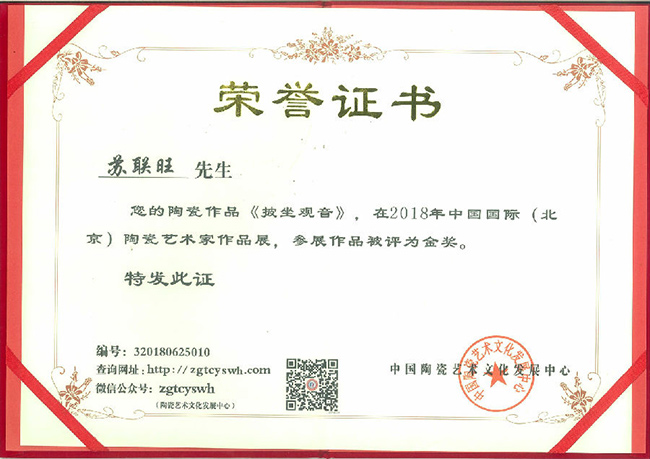 2018年6月,作品《披坐觀音》榮獲2018年中國國際(北京)陶瓷藝術(shù)家作品展評比金獎(jiǎng);