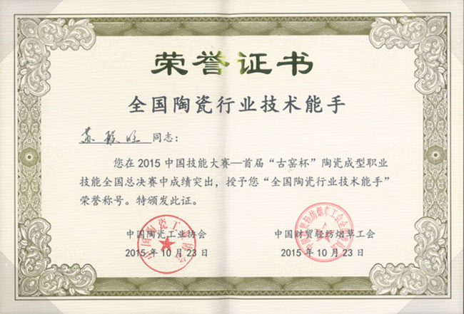 2015年10月,作品《中國夢》在2015中國技能大賽——首屆“古窯杯”陶瓷成型職業(yè)技能全國總決賽中榮獲“全國陶瓷行業(yè)技術(shù)能手”榮譽(yù)稱號;