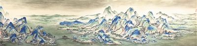 日前,筆者在南昌美術(shù)館展出的“李潤素胎仿古青綠山水瓷板畫作品展”中見到了“瓷本”《千里江山圖》。按照絹本原作同比例復(fù)制,高51.5厘米,原作長1191.5厘米,“瓷本”則分成了6塊,每塊長約200厘米。絹本原作山石先以墨色勾皴,后施青綠重彩,用石青石綠烘染山巒頂部,山峰起伏、江河浩渺,漁村野市間于其中,青山為點,湖泊為面,舟橋為線,咫尺百里,高遠平遠深遠,顯示青山疊翠。這6塊“瓷本”《千里江山圖》較好地將原作復(fù)原,拼在一起,氣勢壯觀。