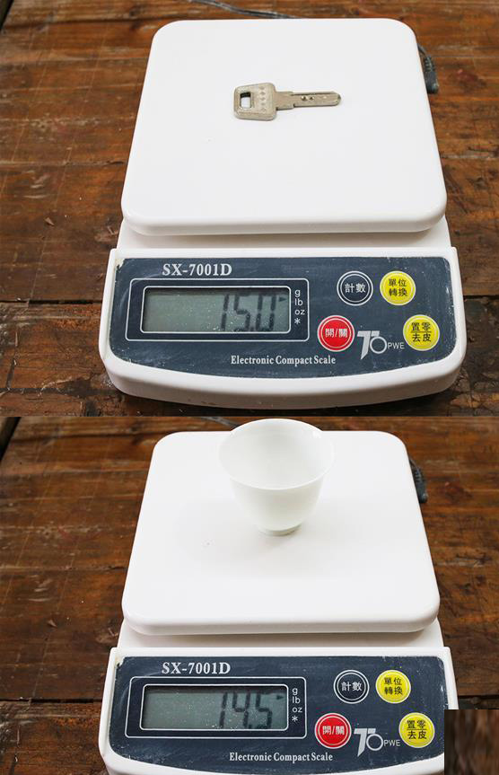 上圖為電子秤顯示一把鑰匙的重量為15克;下圖為電子秤顯示一只茶杯的重量為14.5克。