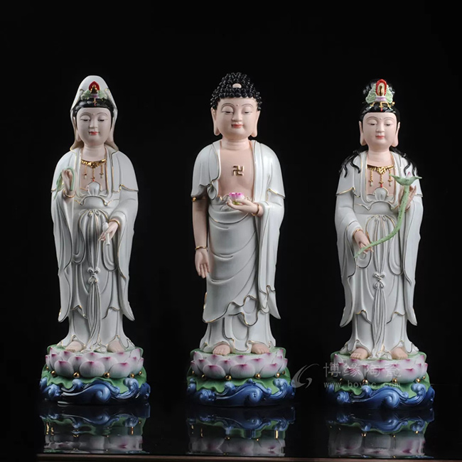 正確的西方三圣佛像擺放方法:中間是阿彌陀佛,左脅觀世音菩薩,右脅大勢至菩薩(此處的左和右是按照阿彌陀佛的左手邊和右手邊)