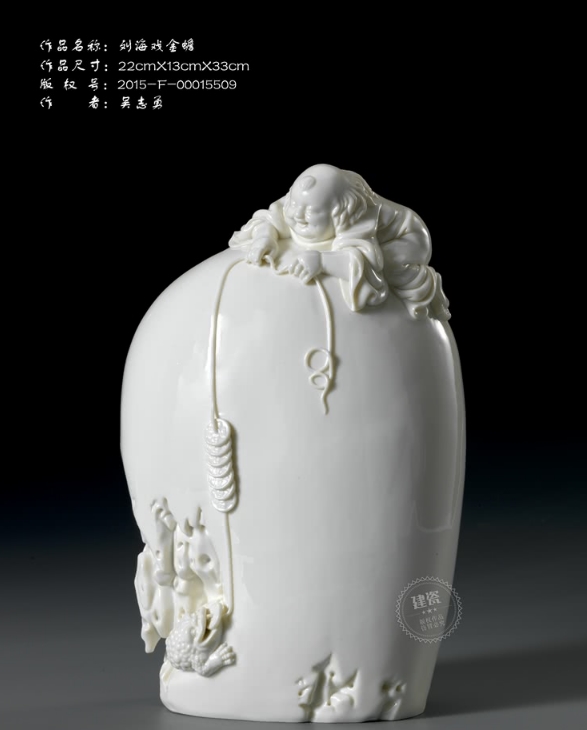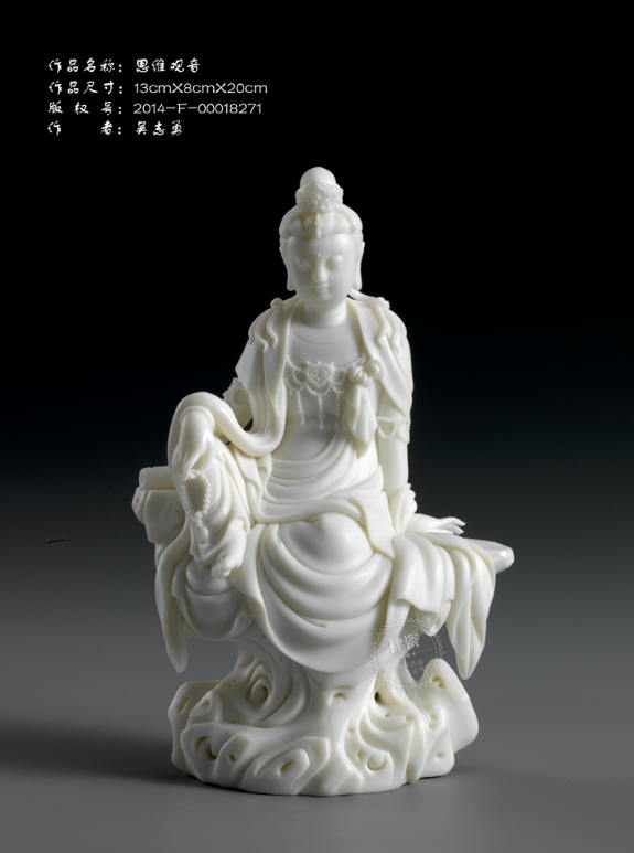 吳志勇大師,雖是青年大師,卻走在中國瓷都德化瓷塑藝術(shù)的領(lǐng)軍行列,連續(xù)三年應(yīng)中央電視臺邀請,擔(dān)任大型鑒寶欄目《一錘定音》的特邀嘉賓。其作品《思維觀音》、《劉海戲金蟾》、《歡喜彌勒》受到專家、同行、社會陶瓷愛好者的高度認(rèn)可和好評,這是一國工匠在藝術(shù)道路上對弘揚傳統(tǒng)文化的奉獻(xiàn),也是保護和傳承世界瓷都德化傳統(tǒng)技藝的現(xiàn)實意義,更是對長期熏陶于瓷塑藝術(shù)的德化匠師們樹立文化自信的激勵。