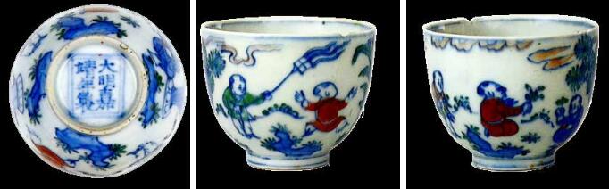 圖3 明嘉靖斗彩嬰戲圖杯及底書青花雙方框“大明嘉靖年制”六字雙行楷書款
