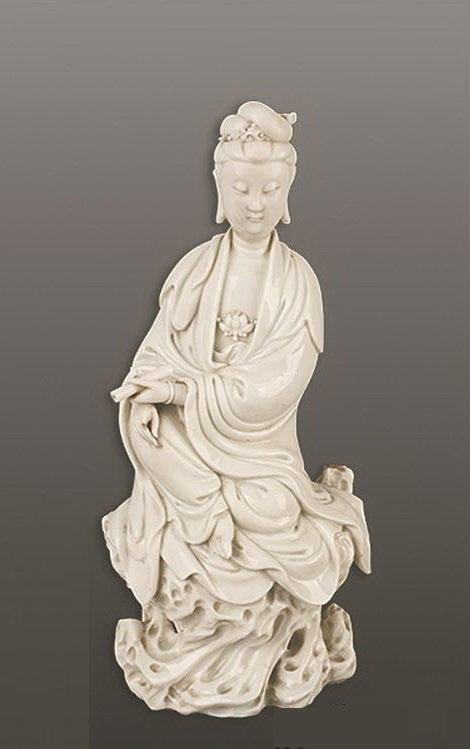 明清德化白瓷中以人物塑像最為豐富、也最具代表性,尤以佛、道人物居多,主要有觀音、佛像、羅漢、達(dá)摩、八仙、福祿壽三星、李白、童子像等。人物塑像胎釉潔白細(xì)膩、溫潤晶瑩,衣紋生動(dòng)飄逸,表情溫和含蓄。