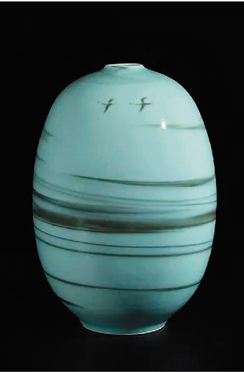 山水主題系列作品的創(chuàng)作利用青釉的燒成特征傳達(dá)青瓷的另一種審美情趣,是一種由有我到無(wú)我、由寫景到造境的創(chuàng)作方法的轉(zhuǎn)變,而創(chuàng)作的精神空間是自由寫意的。