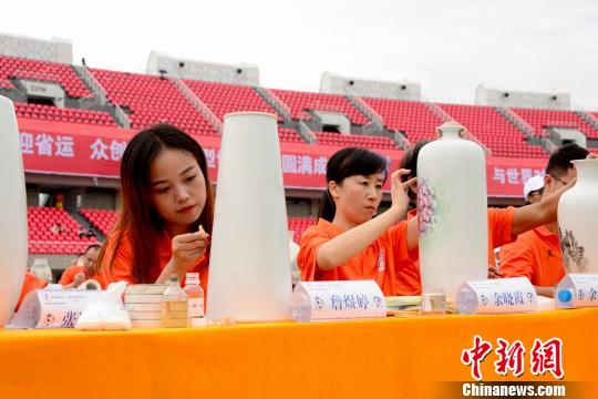當(dāng)天下午,“千名陶藝家迎省運(yùn)眾創(chuàng)吉尼斯榮譽(yù)大型創(chuàng)作活動(dòng)”在江西省第十五屆運(yùn)動(dòng)會(huì)主場(chǎng)館景德鎮(zhèn)市體育中心體育場(chǎng)內(nèi)上演。綠茵場(chǎng)上,千余名陶藝家分散排開(kāi),正身端坐,筆蘸丹青,在白胎瓷瓶上揮毫創(chuàng)作,繪以青花、粉彩,花鳥(niǎo)、山水等題材,盡情展現(xiàn)千年瓷都藝術(shù)風(fēng)采。