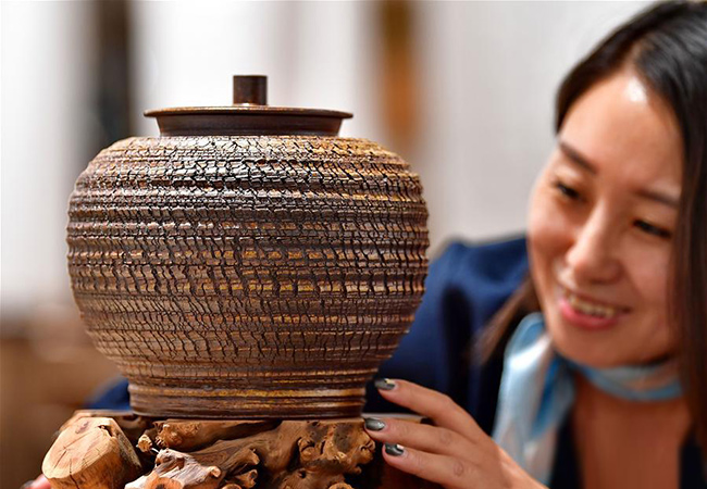9月16日,觀眾在第二十一屆唐山中國(guó)陶瓷博覽會(huì)上欣賞一件作品。