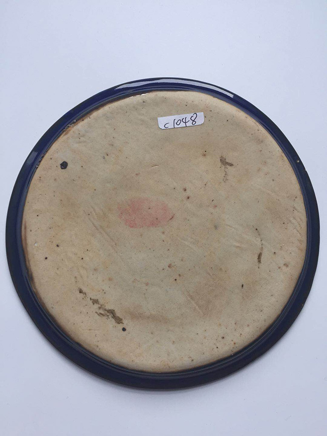 此盤屬于高溫鈷藍(lán)釉瓷器。以鈷料為呈色劑的藍(lán)釉的起源,可以追溯到唐三彩陶器。高溫鈷藍(lán)釉瓷器則是元代景德鎮(zhèn)發(fā)明的。采用當(dāng)時稀少的進(jìn)口鈷料,鈷是青花的呈色劑,融在釉中,即可燒成鈷藍(lán)釉,呈色十分穩(wěn)定。但是色彩鮮艷的藍(lán)釉,除釉色純凈外,尚須有潔白的胎質(zhì)映襯,方能顯現(xiàn)出藍(lán)如寶石的理想釉色。