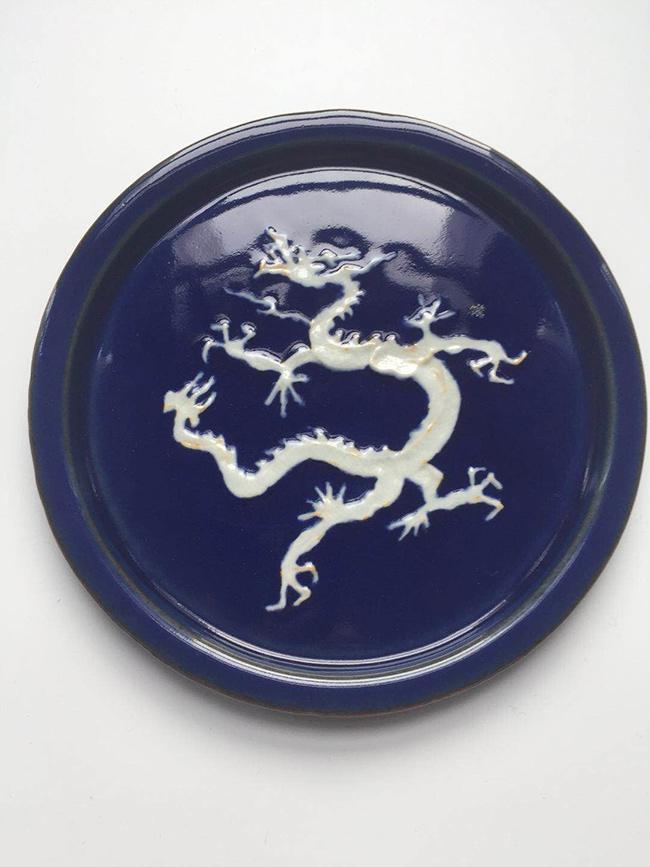 此盤折沿,淺壁,平底。通體內(nèi)外施藍(lán)釉,外底無釉。盤心坦平,在藍(lán)釉地上以白色泥料塑貼一條矯健的白龍。龍細(xì)頸,三爪,作昂首翻騰狀。它是先在素胎上刻劃龍的輪廓和龍鱗;再在龍紋上直到緊邊緣處施乳白釉,并用青花輕輕點出龍的眼睛;然后在紋飾輪廓線外的全部地方施藍(lán)釉作地。