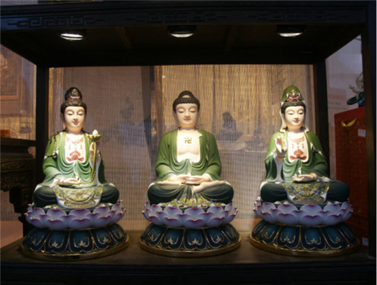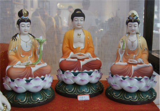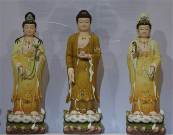 郭桂星介紹,西方三圣又稱(chēng)彌陀三尊,指的是西方極樂(lè)世界三尊主要的佛菩薩,即教主阿彌陀佛和他的左脅侍觀世音菩薩、右脅侍大勢(shì)至菩薩。造像上,三者皆在蓮座上,蓮象征出淤泥而不染,于一真法界而能應(yīng)化在十法界;阿彌陀佛居中,觀音菩薩脅侍在左,大勢(shì)至菩薩脅侍在右。三者塑像或畫(huà)像為修行凈土宗者禮敬的對(duì)象。