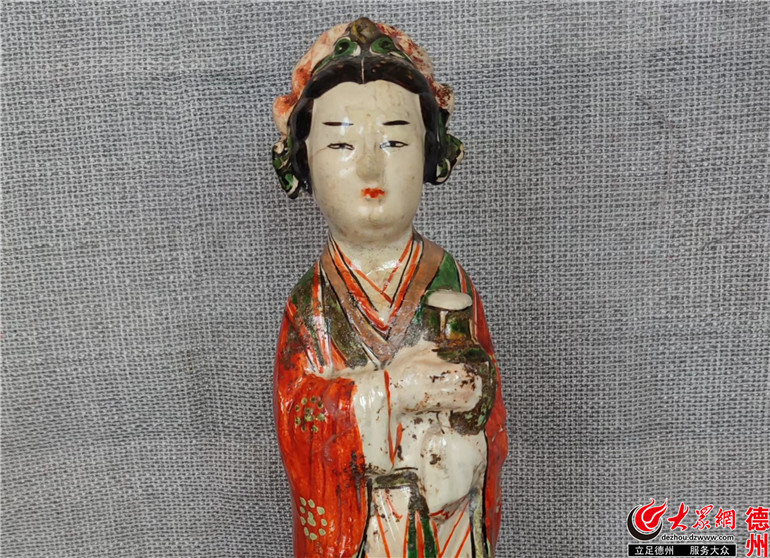 “德州窯出土的紅綠彩瓷器是我國陶瓷藝術(shù)中色彩濃艷、風格鮮明,極具民間特色的彩瓷”,德州職業(yè)技術(shù)學院副教授、紅綠彩陶瓷畫師霍云芳介紹說,燒制方法是在高溫燒成的白釉器上用紅、綠為主等彩料勾畫紋飾,再入窯800 ℃低溫燒制的釉上彩繪瓷器。因此也常被 稱為“宋加彩”或“金加彩”。主色為紅、綠、黃三色為主 , 色彩對比強烈。裝飾紋樣以花枝、云紋等紋樣居多,局部施紅彩,并有濃淡之分。整體裝飾以紅彩勾勒為主,填涂為輔,線條流暢舒展,有艷麗明艷之感。德州窯的紅綠彩瓷加入黑色居多,人物俑五官衣紋均是黑色描出,衣服施紅、綠色塊;日用器皿主有有碗、盤、罐、瓶、紅綠彩縛捆嬰兒與摩睺羅、人物俑等,反映出北方人民的生活特征,具有鮮明的地域特色。
