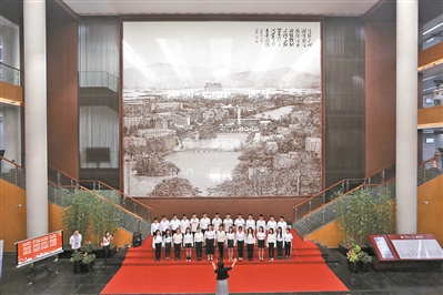 值得一提的是,該陶瓷壁畫采用淺浮雕工藝燒制而成,偌大的畫面包括有勵吾樓、建筑紅樓、人文館、西湖、湖心亭、拱橋等華工校內(nèi)具有歷史紀(jì)念意義的建筑和景觀。畫作更融合了水墨山水筆意,采用黃金分割線構(gòu)圖,讓人仿佛聽到鐘聲裊裊,看到西湖波光粼粼。而題跋內(nèi)容是校歌歌詞,彰顯了華工深厚的歷史文化底蘊(yùn)和志存高遠(yuǎn)的胸懷抱負(fù)。
