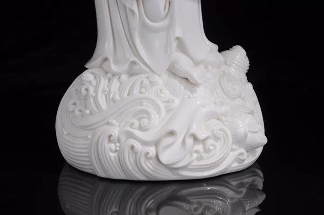 作品《渡海觀音》傳承何派觀音雕塑風(fēng)格,以德化特有的溫潤如玉的“中國白”為胎質(zhì),純手工制作,作品圓勁有力如凝脂似玉,滋潤瑩滑,神情嫻雅平靜,安詳自若,雙目低垂凝思,衣紋線條清晰、簡潔、瀟灑,多變化,柔媚流暢,翻轉(zhuǎn)自然,觀音雙手藏袖,露一足踏蓮花,另一足水花掩蓋,作踏浪凌波渡海之勢刻畫的栩栩如生。經(jīng)高溫1300多度燒制,整尊造像美倫美煥,活靈活現(xiàn),是一件上乘之品。