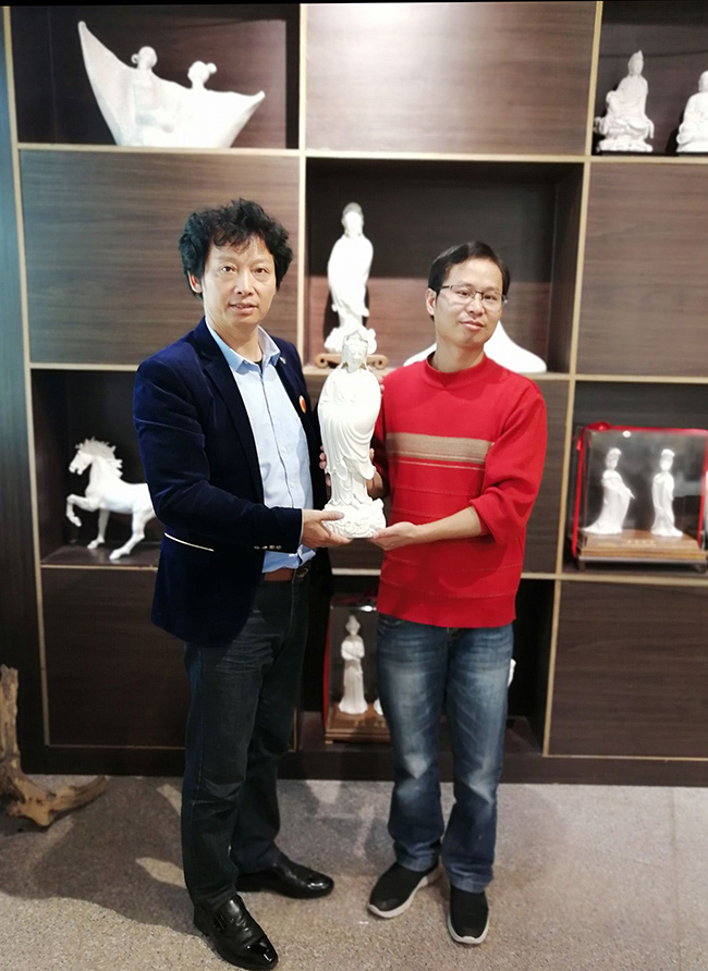 近日,景德鎮(zhèn)市國(guó)匯陶瓷藝術(shù)名家協(xié)會(huì)會(huì)長(zhǎng)、風(fēng)火仙師童賓第十九代傳人——童義春,蒞臨德化博緣陶瓷指導(dǎo)交流并饋贈(zèng)其佳作《年年有余》;博緣陶瓷總經(jīng)理柯維太熱情接待,并與童義春大師積極探討陶瓷創(chuàng)作與未來(lái)發(fā)展。