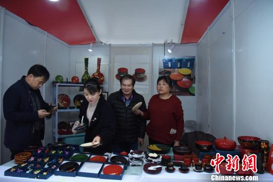 臺(tái)灣參展商吳樹發(fā)展示了其手工制作的木質(zhì)繪畫作品,博得不少大陸客商的青睞!