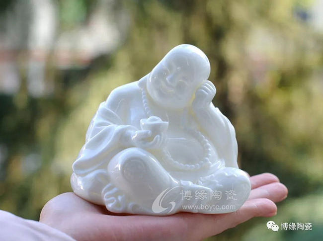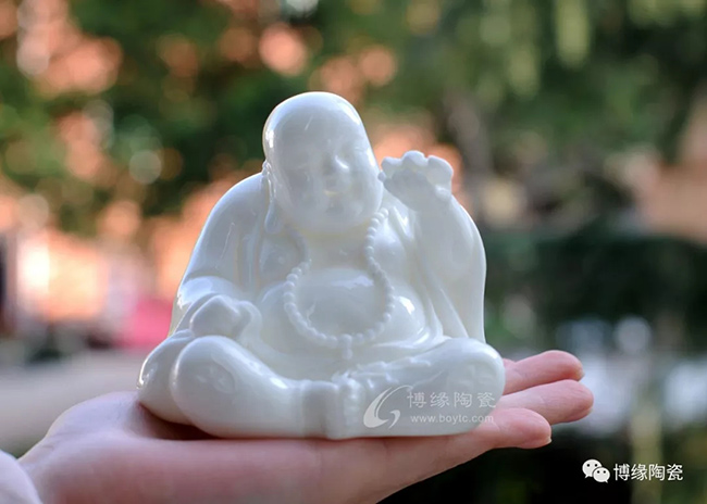 彌勒擺件系列作品,精選上萬元每噸原瓷泥料,經(jīng)過精心加工,其含雜質(zhì)少,瓷質(zhì)白,白度高達(dá)95%,是白瓷中之精品,在光照之下,白如凝脂,透潤如玉,胎釉透亮。