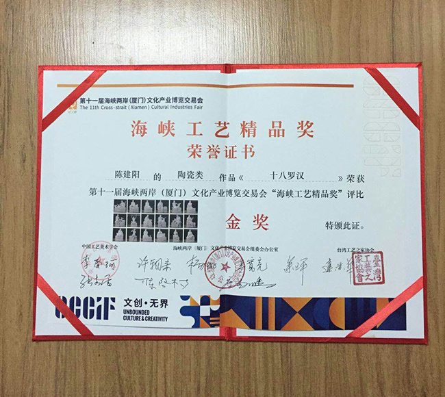 近日,福建省工藝美術(shù)大師陳建陽作品《十八羅漢》在第十一屆海峽兩岸(廈門)文化產(chǎn)業(yè)博覽交易會(huì)“海峽工藝精品獎(jiǎng)”評比中榮獲金獎(jiǎng)。