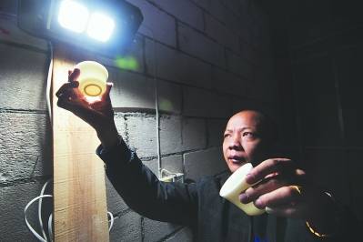 徐福坤在燈光下檢查作品。