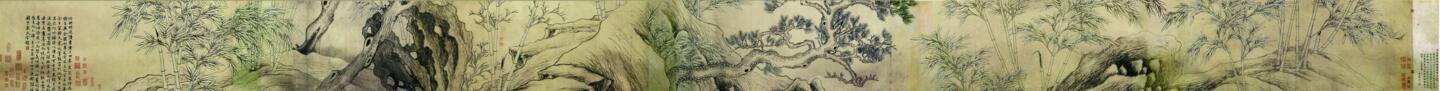 目前發(fā)現(xiàn)并被認可的張遜館藏作品只有兩件,一件是北京故宮博物院藏《雙鉤竹石圖》卷(圖1),另外一件是美國大都會藝術(shù)博物館藏張遜《松石圖》卷!峨p鉤竹石圖》卷,至正九年(1349)作,紙本,水墨雙鉤,縱43.4、橫668厘米,現(xiàn)藏北京故宮博物院。圖中描繪了竹叢古松、高坡和湖石,山崗間有雙鉤技法繪成的竹子數(shù)叢,枝干勁挺,竹葉茂盛,高低疏密有致,中間老松俯仰。山石用中鋒圓筆鉤皴。