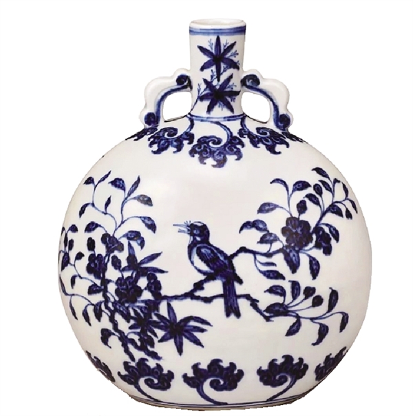 據(jù)《清檔》記載,雍正帝曾不止一次遣送清宮所藏瓷珍至景德鎮(zhèn)以資效仿,為了達到與永樂時期一致,通常無款,而后乾隆時期,產(chǎn)量劇增,而且都落乾隆款識。東京中央這件抱月瓶,便是雍正皇帝仿永樂青花抱月瓶中的經(jīng)典之作。腹部兩面各繪一喜鵲立于梅枝,一只抬頭翹首相望,另一只則微微俯視。繪畫生動,寓意“喜上眉梢”,故將其稱之為“一只鳥”。