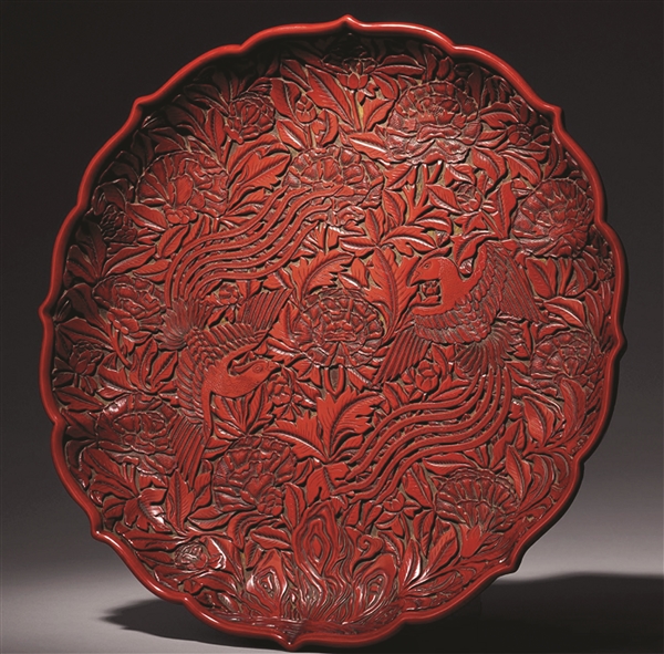 項立平所指的“兩只鳥”,是指元到明初的漆器剔紅花鳥紋菱口大盤以及其代表的雜項佳器尤其是精品漆器。“這次東京中央春拍推出了‘七彩芳華——重要漆器專場’,其中這件典型的元代-明代初期的剔紅精品十分值得關注。驚艷的菱花形,采用了雙層紋飾的工藝手法,盤外壁滿雕花卉紋,兩只鳳凰舞于其間,間隙處微露黃底漆,刀法圓潤,展現(xiàn)出十分明顯的時代特征。從包裝和簽條來看,是十分典型的在日本流傳的中國漆器精品。”他介紹道。