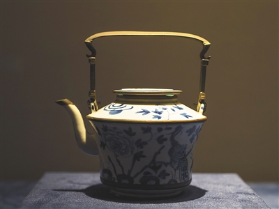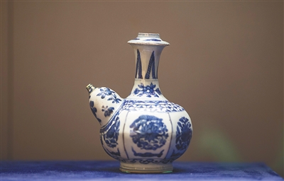 幾件青花軍持——乳房狀注口瓷水壺花紋淡雅別致,線條圓潤。據(jù)介紹,軍持最初使用跟印度佛教密切相關(guān)。13世紀(jì)中后期伊斯蘭教傳入東南亞并得到進一步發(fā)展后,軍持繼續(xù)為當(dāng)?shù)厝嗣袼谩?ldquo;軍持這種器型在當(dāng)時的中國國內(nèi)是不多見的,一般都是為東南亞國家專門訂制。當(dāng)時,東南亞人民對這一器物需求量大,所以,今天我們能夠在東南亞地區(qū)發(fā)現(xiàn)大量遺存。”故宮博物院器物部研究館員、該展策展人董健麗說。