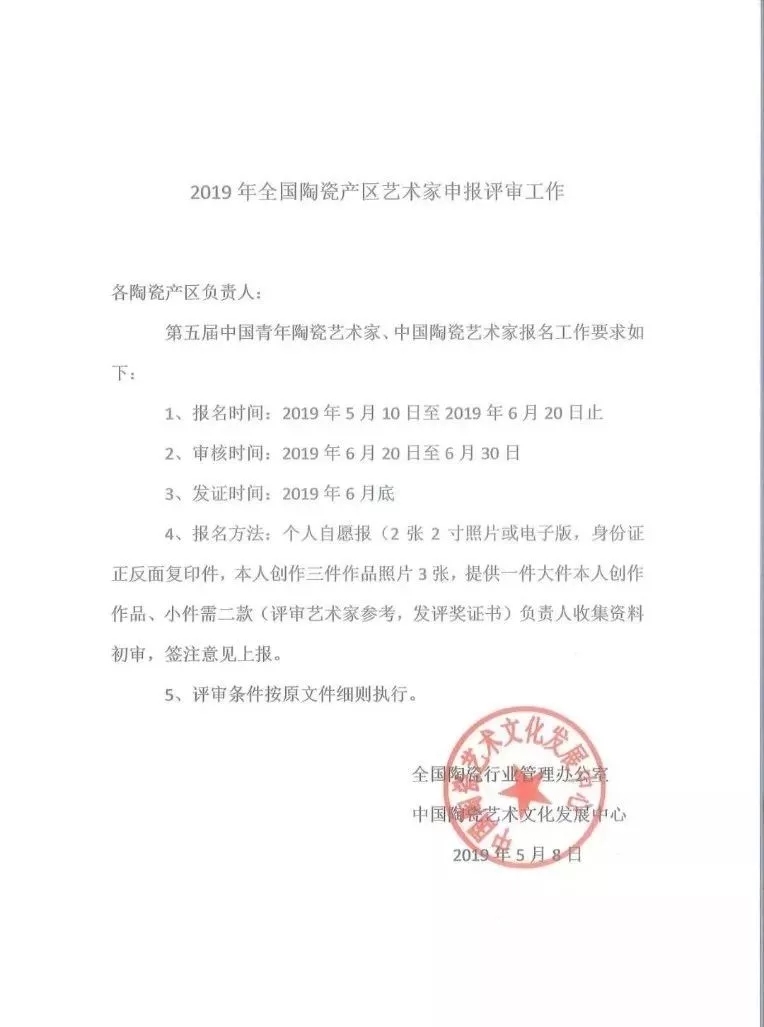 2019年全國(guó)陶瓷產(chǎn)區(qū)陶瓷藝術(shù)家申報(bào)評(píng)審工作的通知