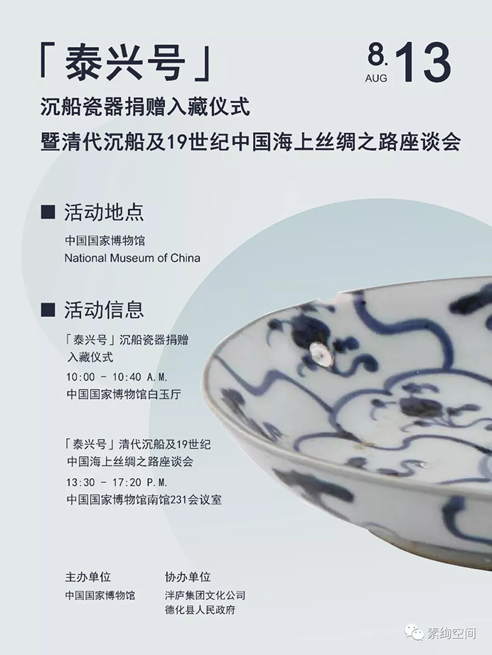 8月13日,由中國(guó)國(guó)家博物館主辦,泮廬集團(tuán)文化公司、德化縣人民政府協(xié)辦的“泰興號(hào)”沉船瓷器捐贈(zèng)入藏儀式在中國(guó)國(guó)家博物館白玉廳舉行。190多件“泰興號(hào)”沉船古瓷器入藏中國(guó)國(guó)家博物館。