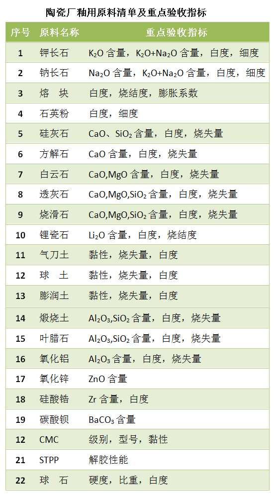 陶瓷的釉用原料中有部分原材料的名稱與坯用坭砂原料看似相同,但實際上在技術(shù)指標與加工方法上都有很大不同,因此,業(yè)內(nèi)習慣把釉用礦物原料與其他化工料一起,統(tǒng)稱為化工料。