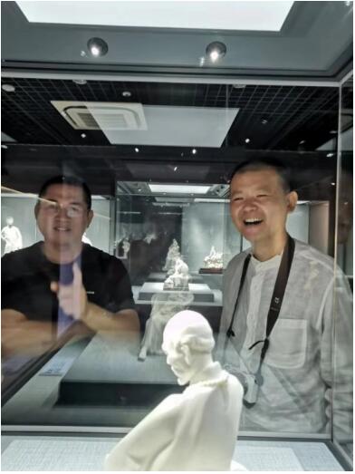 我們在看產(chǎn)區(qū)陶瓷作品的時候,有時候會是兩種角度,即你是把它當(dāng)成工藝品來看,還是當(dāng)成純藝術(shù)品來看?是當(dāng)做商品來看還是當(dāng)做藝術(shù)作品來看?這里面是有差別的。我也跟他聊過,前面二三十年做的東西一直也是有變化的,我倒希望到了后面,變化還可以再大一點(diǎn),譬如可以在創(chuàng)作中更多一點(diǎn)兒現(xiàn)實(shí)題材的作品,這樣更能體現(xiàn)你作為一個藝術(shù)家或者陶瓷藝術(shù)家所應(yīng)有的一種擔(dān)當(dāng)。 從商業(yè)上看,之前你做的肯定是很成功的,說明你之前這么多年的東西肯定是很受大家歡迎的。但是我從一個美院教師的角度來講,我覺得商業(yè)上的成功和學(xué)術(shù)上或藝術(shù)探索上,還是有一點(diǎn)點(diǎn)差別的。既然商業(yè)上已經(jīng)做到這個程度了,可以拿出一部分時間做一些純藝術(shù)探索的東西,這些東西不一定是最好賣的,但可能能顯示出你在當(dāng)?shù)卮伤茴I(lǐng)域里,你能比別人走得更遠(yuǎn)。做羅漢或觀音等這些德化經(jīng)典的題材,肯定好賣,但是從藝術(shù)探索或者從創(chuàng)作和學(xué)術(shù)的角度來講,新的題材可能更難表現(xiàn),也更能體現(xiàn)出你對藝術(shù)的一種判斷和認(rèn)識。你后期創(chuàng)作了一部分現(xiàn)當(dāng)代題材的作品,如《弘一法師》《魯迅》就是新的題材和技法,這些作品包括《掏耳羅漢》等作品,已經(jīng)超出了德化傳統(tǒng)瓷塑技藝的范疇,我覺得這就是一種新的有意義的探索,我希望你可以在這方面再往下發(fā)展一步,可以做的再深入一些。”