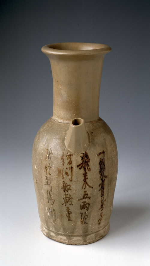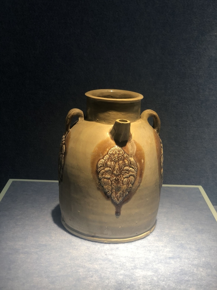青釉褐斑模印貼花椰棗紋執(zhí)壺。