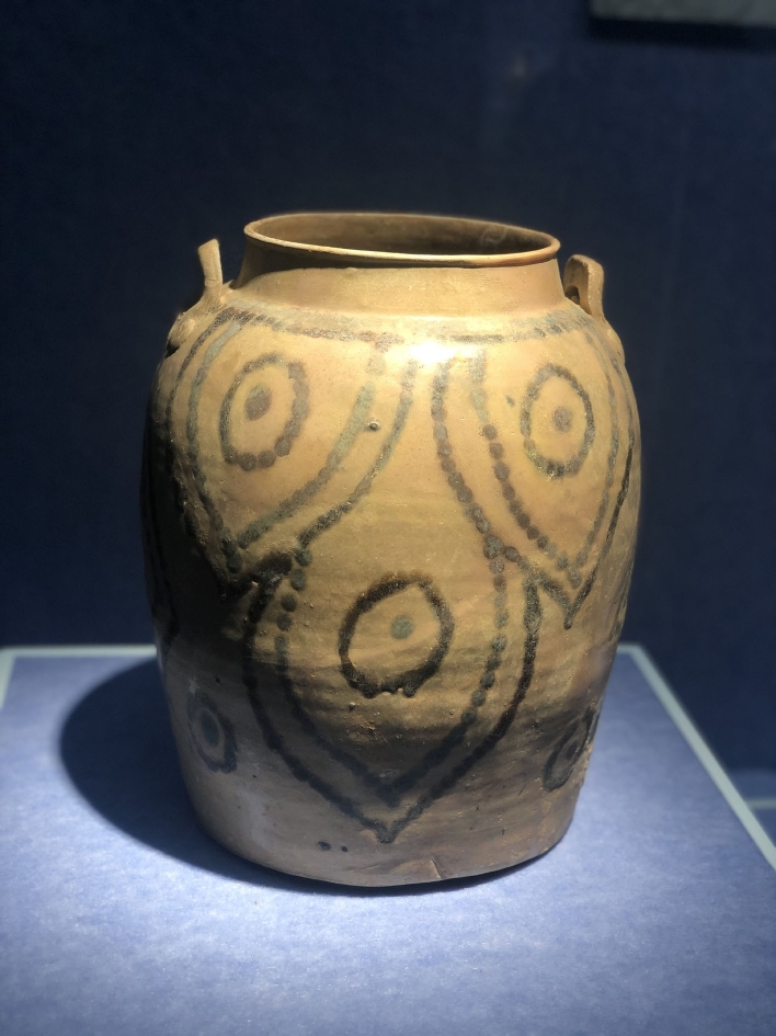 唐代長沙窯褐釉點綠彩大罐是揚州博物館的一件“鎮(zhèn)館之寶”,這次毫無疑問出現(xiàn)在了展廳內(nèi)。在所有被發(fā)掘出土的長沙窯瓷器中,這件文物器型屬大者,紋飾屬孤品,代表了唐代長沙窯陶瓷藝術(shù)的最高水平,被稱作“長沙窯之王”。