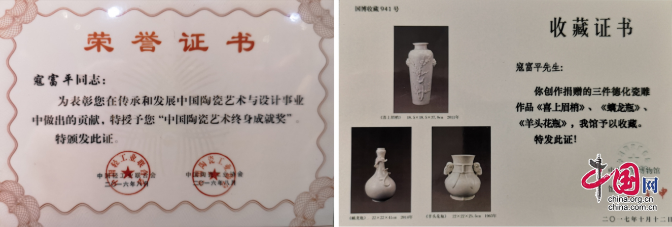 寇富平從事陶瓷研究創(chuàng)作已逾60年,畢生都致力于德化古名瓷“建白瓷”的恢復(fù)研究。馳譽(yù)于明代,其特點(diǎn)可用“白中泛黃、溫潤剔透”這八個(gè)字概括,為古代“海上絲綢之路”的出口商品之一,并被推為白瓷的代表,自清代中晚期以來,其燒制技術(shù)逐漸失傳。1959年福建省委決定恢復(fù)德化縣的品種研發(fā)生產(chǎn),剛從景德鎮(zhèn)陶瓷學(xué)院畢業(yè)的寇富平被分配到省城的研究所工作,參與德化明朝的恢復(fù)研究。工作持續(xù)到1963年,終于拿出了研制成果。經(jīng)過專家與古瓷片比較,復(fù)原出來的白瓷在質(zhì)量上得到了認(rèn)可。